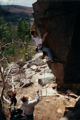 Here's a photo dating back to 1995 (wow! already 15 yrs!). Leading is Mitch Leblanc on the classic "Leviathan" in Welsford, NB. The funny thing about this photo is that it actually shows Mitch "Z-clipping" the second bolt. Belaying is Chris Jones. This inseparable duo sent all the hard lines in Welsford then began putting up testpieces of their own such as Access Denied (5.13a), What's a paradigm (5.12+), Perfect (5.12b), and more.